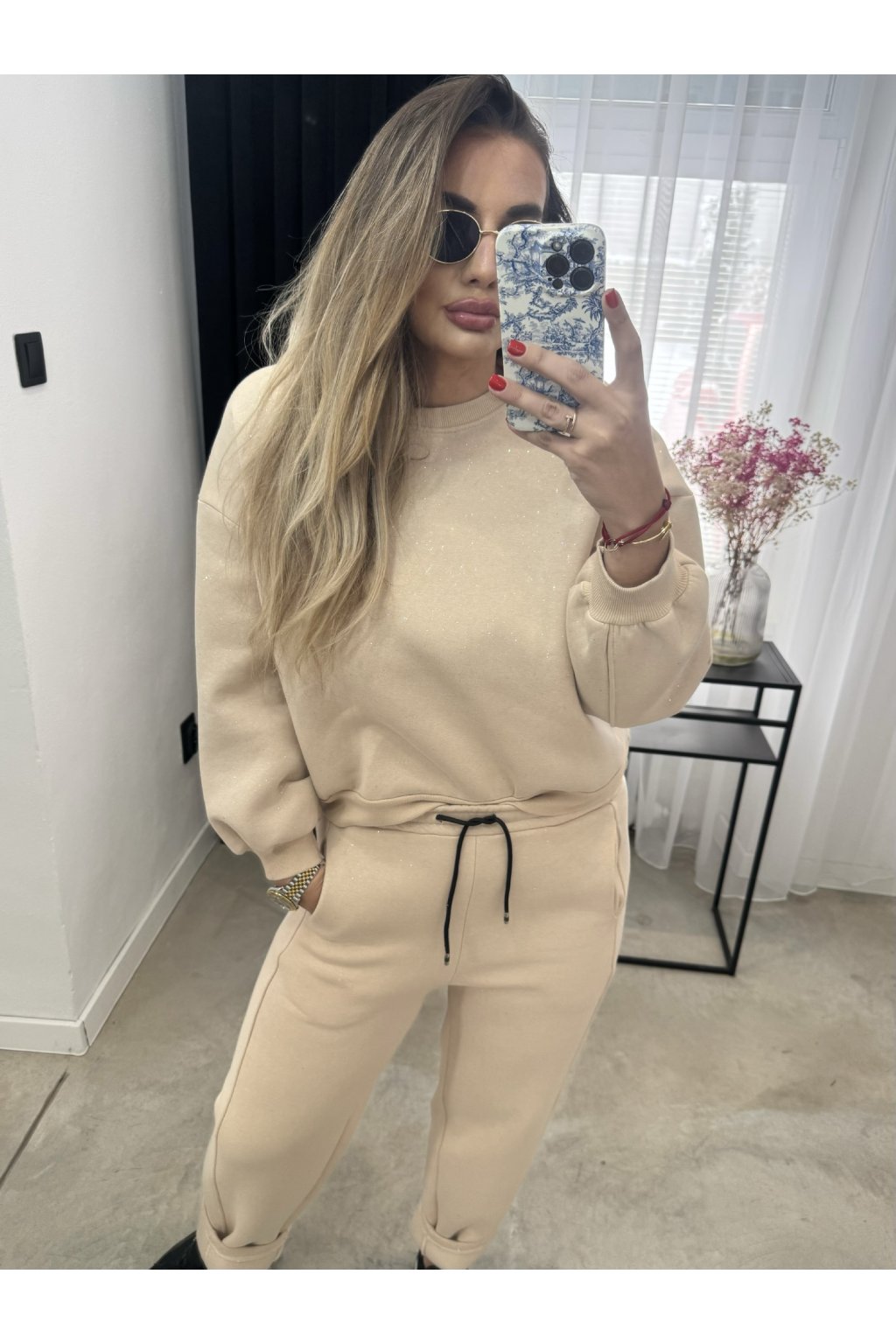 Béžová tepláková súprava so zažehlenými trblietkami. Tepláková súprava sa skladá z mikiny bez kapuce a teplákov s mierne využeným strihom bez patentu na spodnej časti. Súprava je hrubšieho zatepleného materiálu