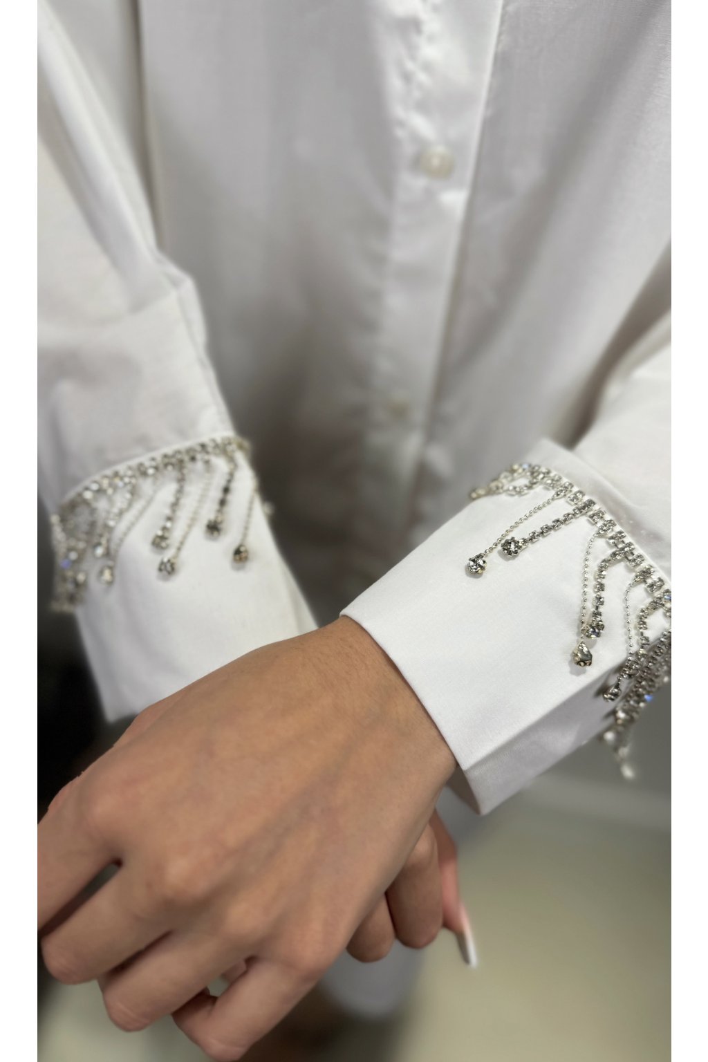 Biela oversize predlžená košela s retiazkami na zápestiach a okolo golieru . Velkosť UNI sedí od XS po XL