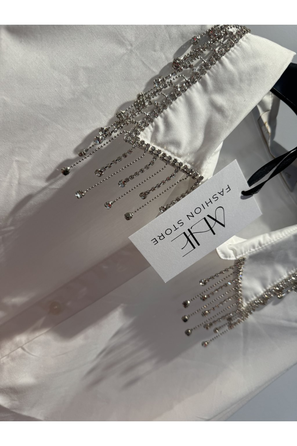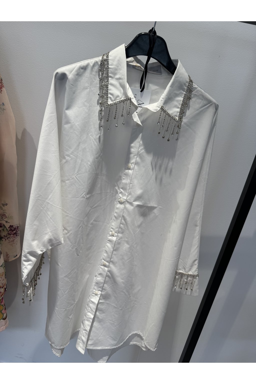 Oversize biela košela s retiazkami na golieri a rukavoch .