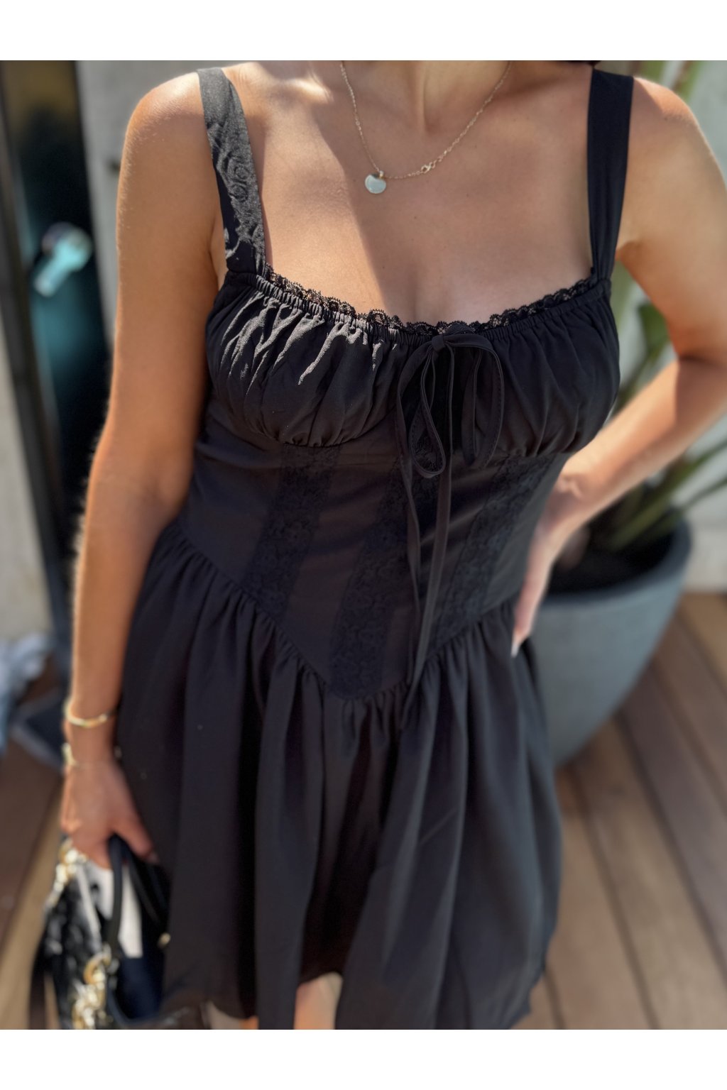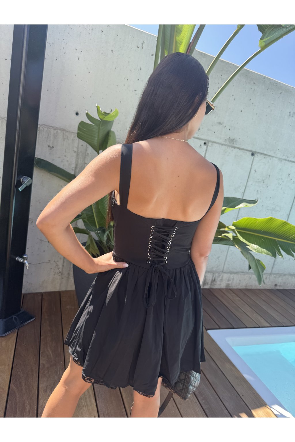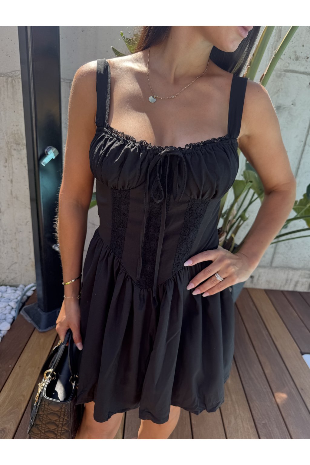 Tieto elegantné čierne mini šaty sú stelesnením ženskosti a sebavedomia. Horná časť so zvrásneným dekoltom a jemným viazaním zvýrazní váš pôvab, zatiaľ čo korzetové panely opticky tvarujú postavu a dodávajú jej zvodný vzhľad. Ľahká sukňová časť sa pri chôdzi krásne vlní a zaručí vám komfort počas celého dňa.