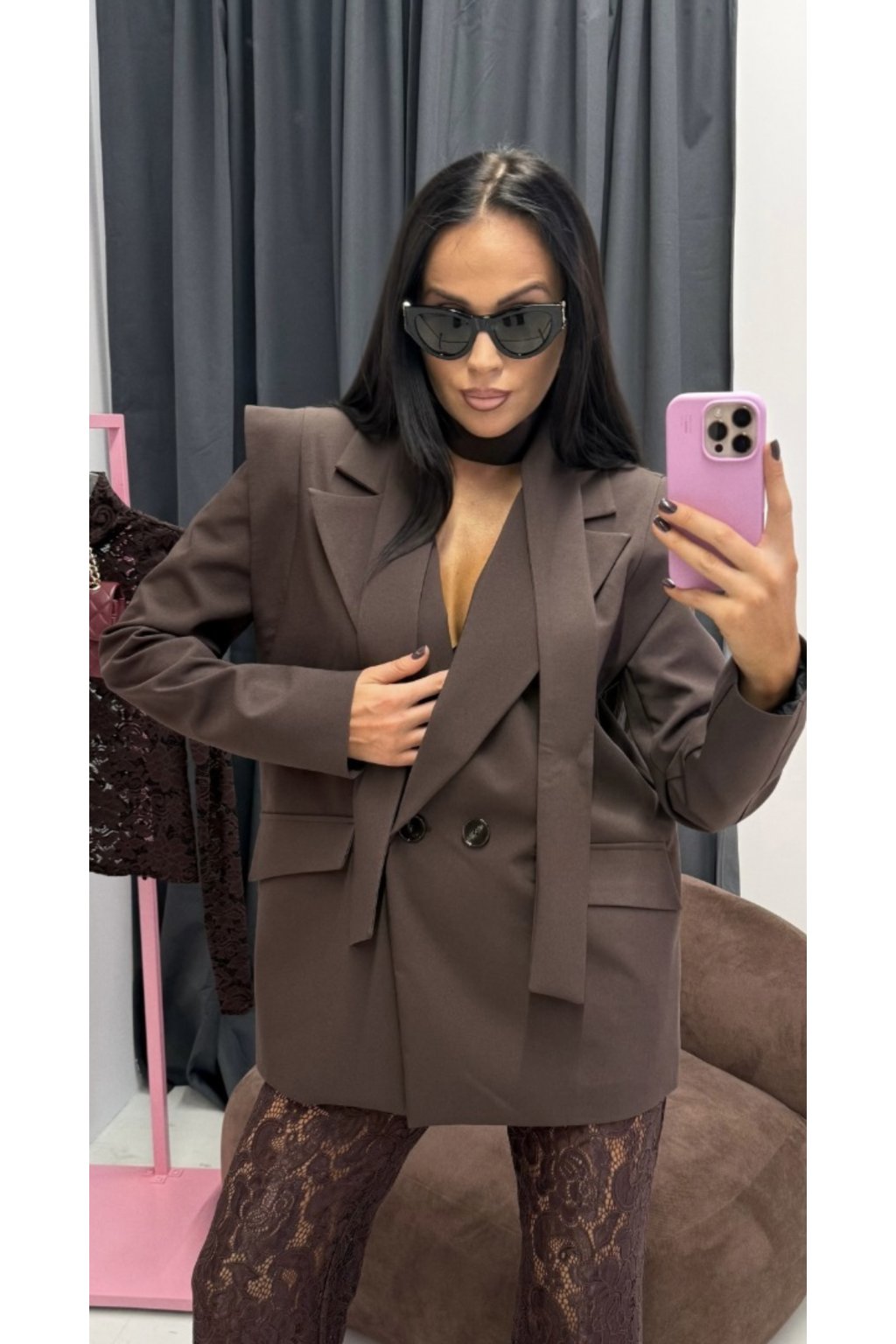 Predĺžené overzise sako s vypchávkami na ramenách.Dá sa nosiť na viacero spôsobov, súčastou saka je opasok .Ďalšími prvkami, ktoré odlišujú tento model, sú ramenné vypchávky a vyčnievajúci materiál.Model na gombík má predné vrecká s chlopňou.