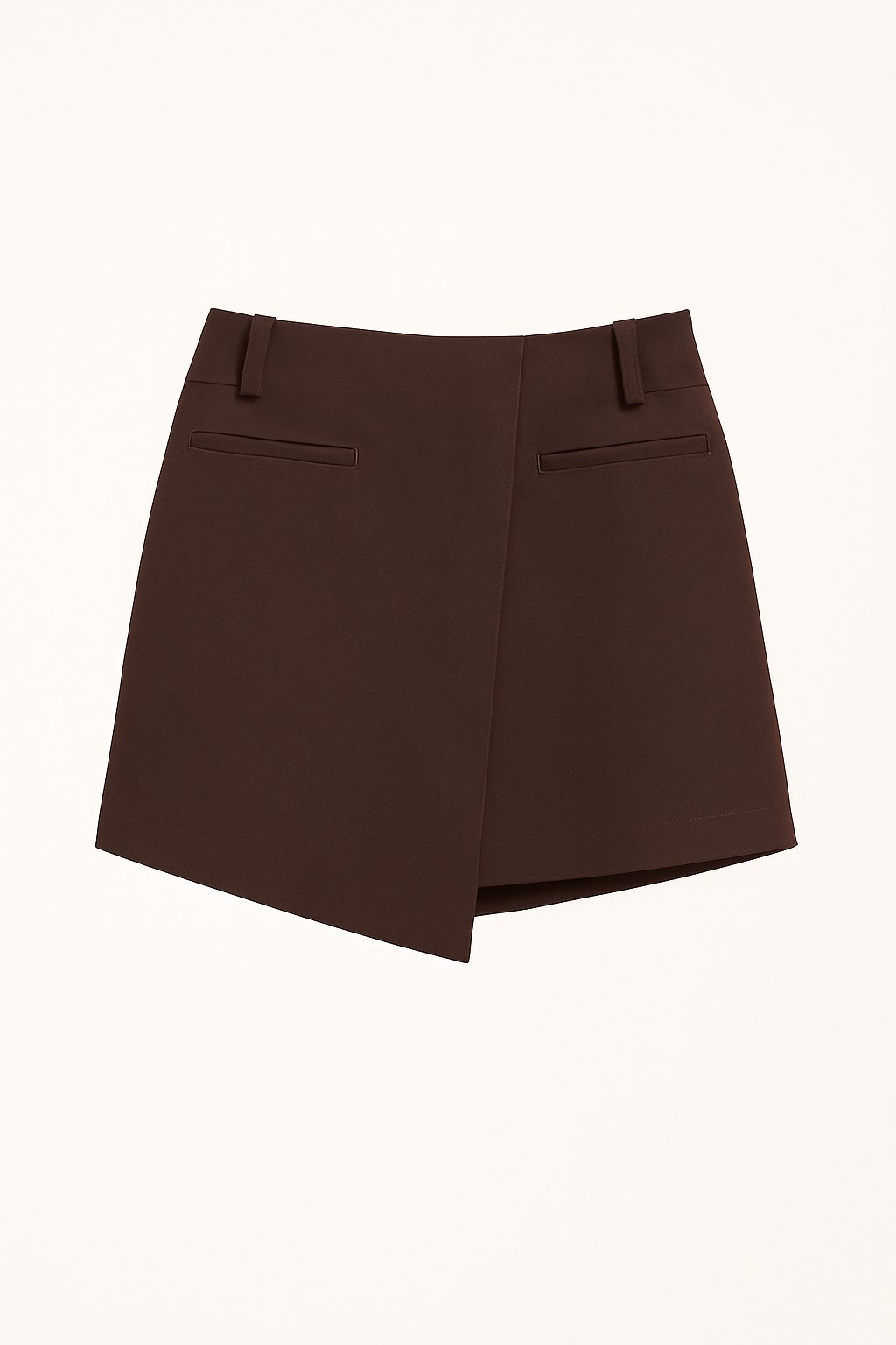 Elegantný hnedý skort, ktorý spája štýl sukne a pohodlie šortiek. Minimalistický dizajn s asymetrickým predným dielom pôsobí moderne a sofistikovane. Vyrobený z kvalitného materiálu, ktorý pekne drží tvar a je vhodný na celodenné nosenie.