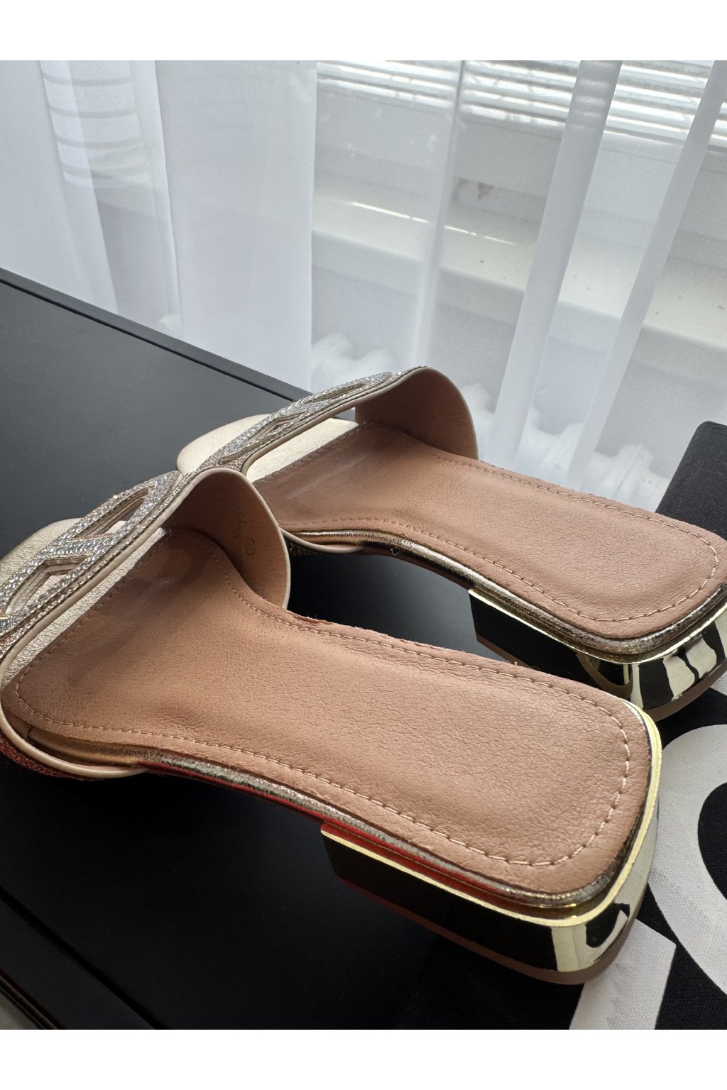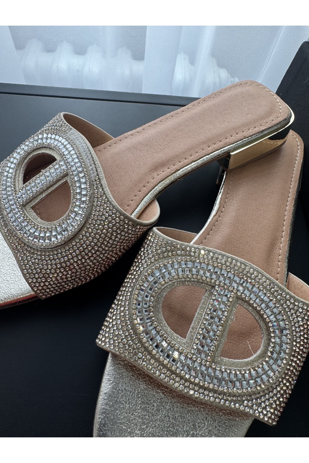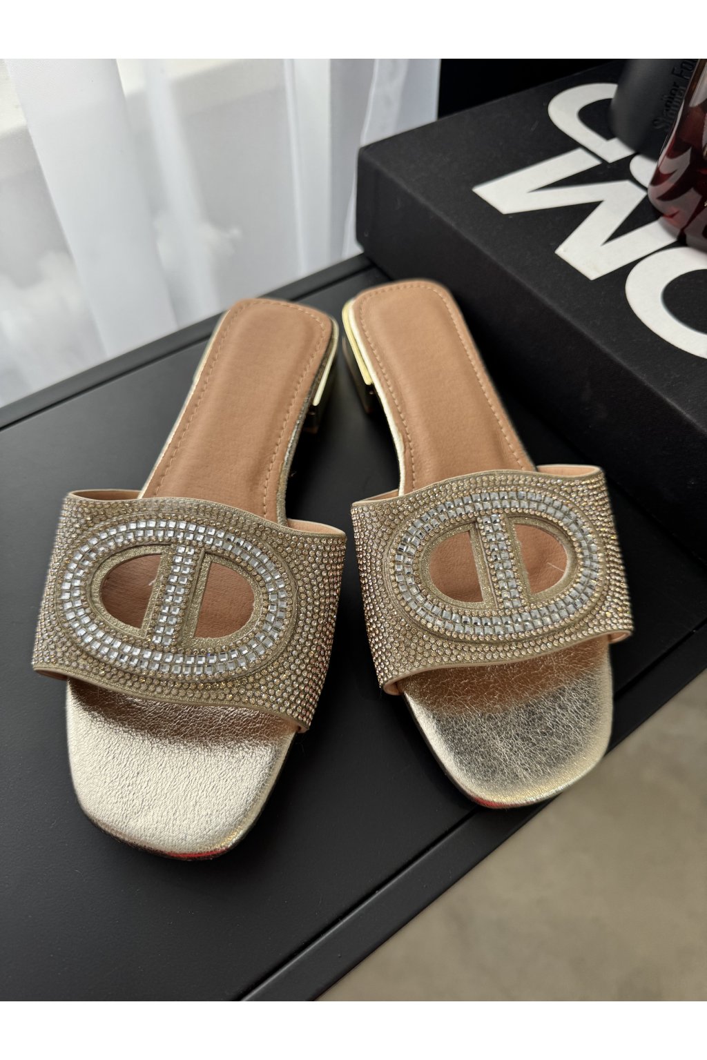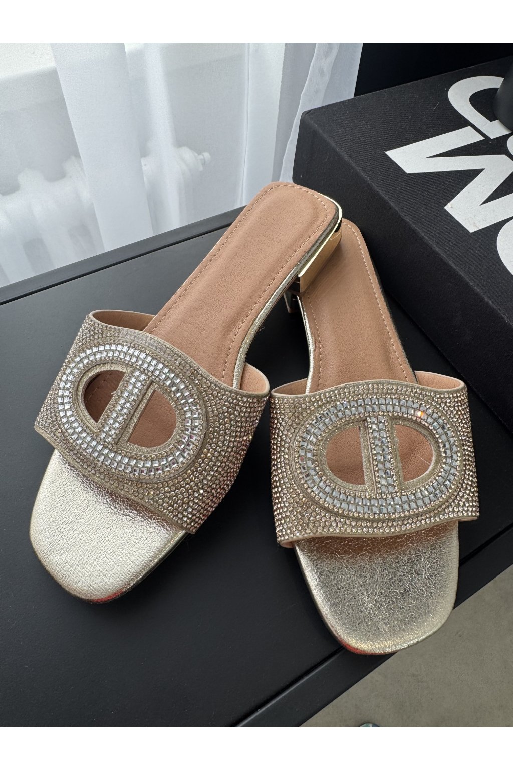 Šlapky zlatej farby s jemným opätkom a s kamienkovym detailom .
