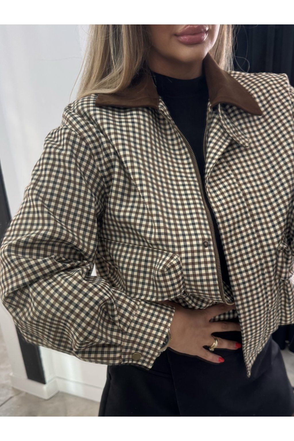 Štýlová oversize károvaná bunda v modernom bomber strihu s kontrastným hnedým golierom. Kratší strih krásne zvýrazní postavu a ľahko ju skombinuješ so sukňou, šatami aj džínsami. Ideálny kúsok na jesenné dni, ktorý dodá outfitu elegantný a trendy look.