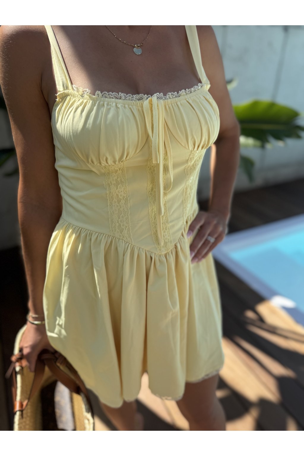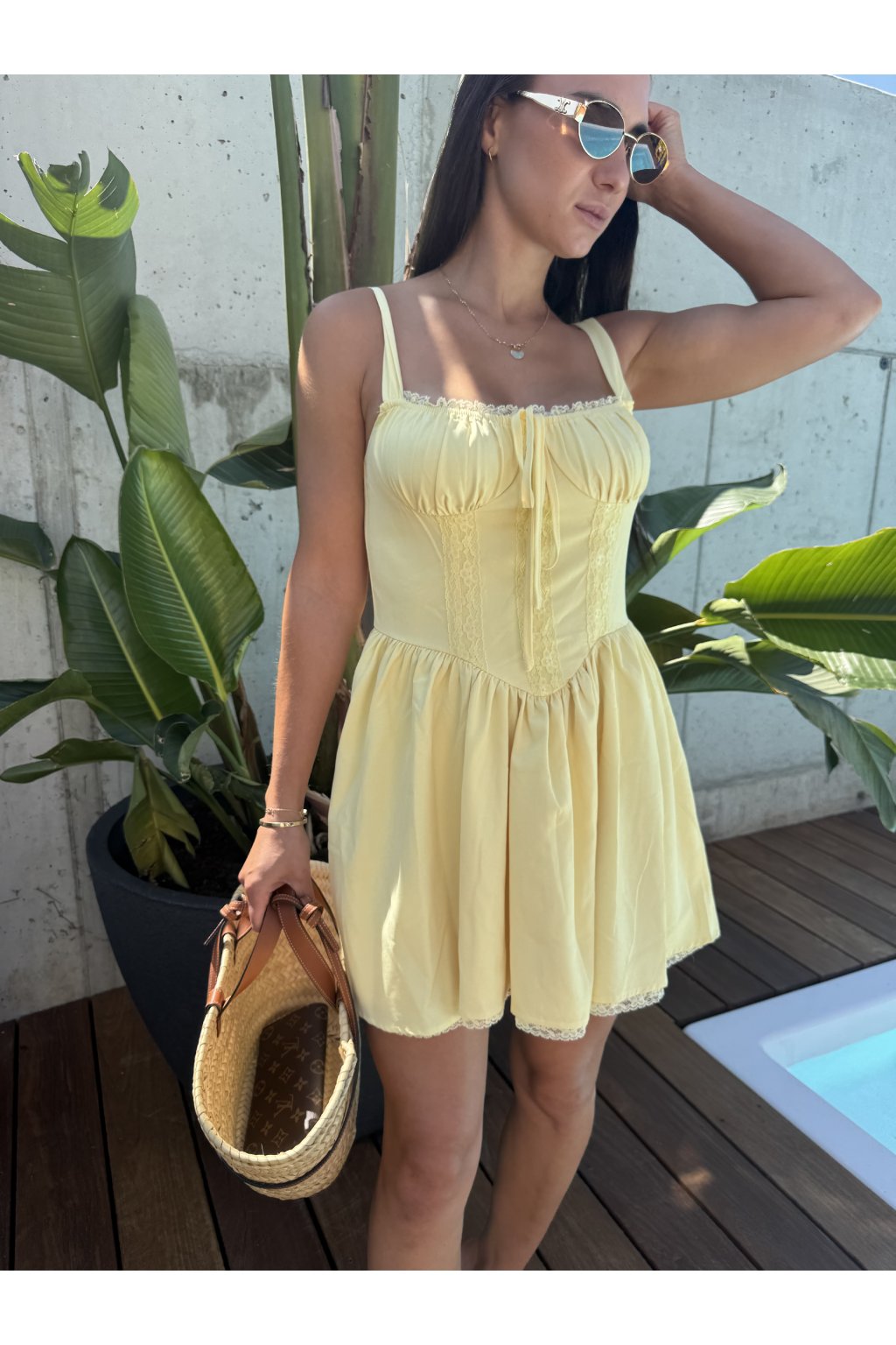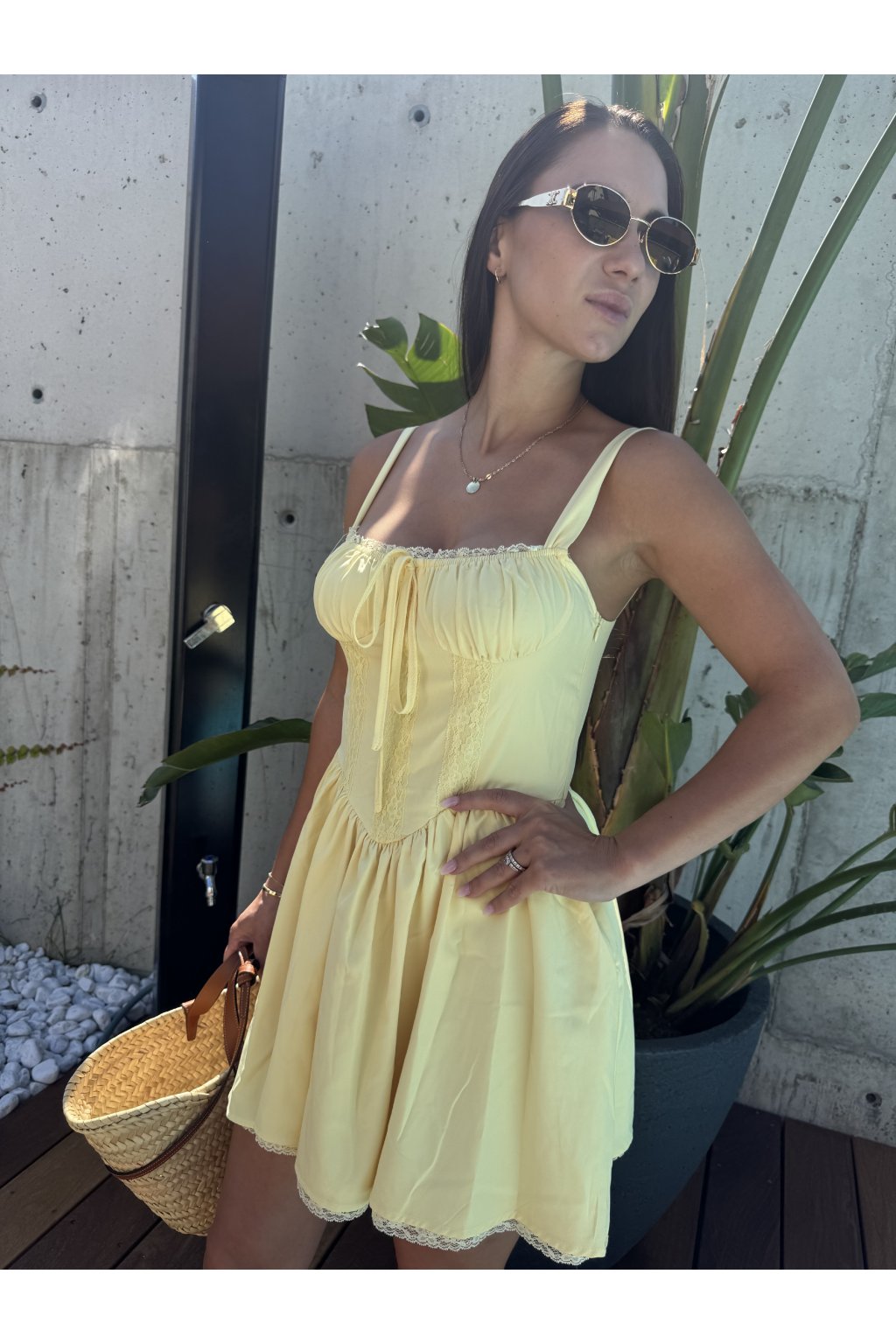 Rozžiarte svoj deň v týchto nežných žltých mini šatách, ktoré spájajú ženskosť a pohodlie. Jemný korzetový strih so šnurovaním vpredu krásne zvýrazní postavu, zatiaľ čo voľná sukňa dodá šatám hravý a vzdušný look. Dekorativné čipkové detaily pôsobia romanticky a letne.
