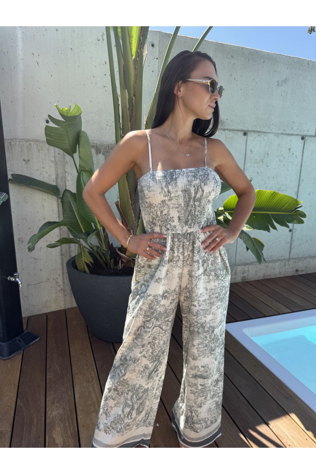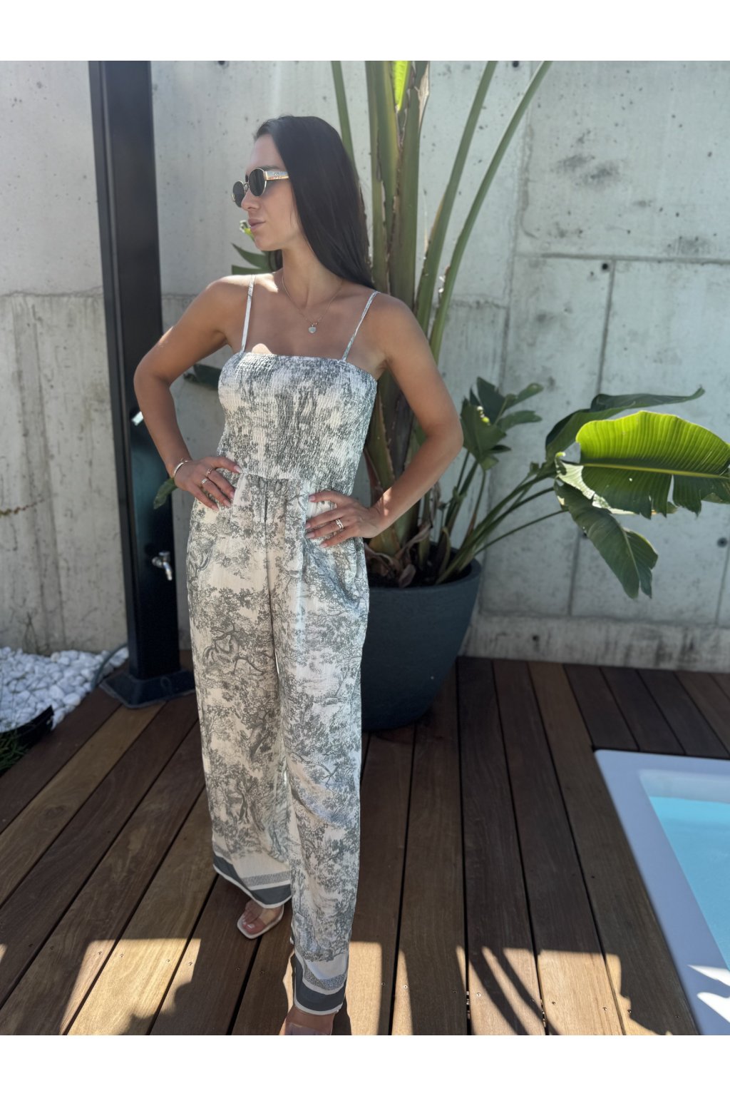 Elegantný letný overal, ktorý spája pohodlie a luxusný vzhľad. Vyrobený z ľahkého, priedušného materiálu, ideálny na horúce dni aj večerné prechádzky. Voľný strih a nastaviteľné tenké ramienka zabezpečia maximálny komfort, zatiaľ čo originálny vzor v štýle „ala Dior“ dodáva outfitu sofistikovaný nádych.V hornej časti je gumička vďaka čomu sa dobre prispôsobí a volne strihané nohavice.