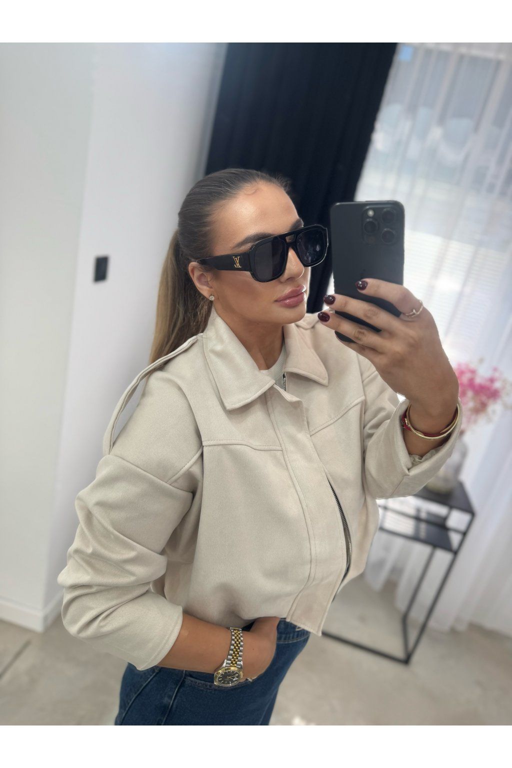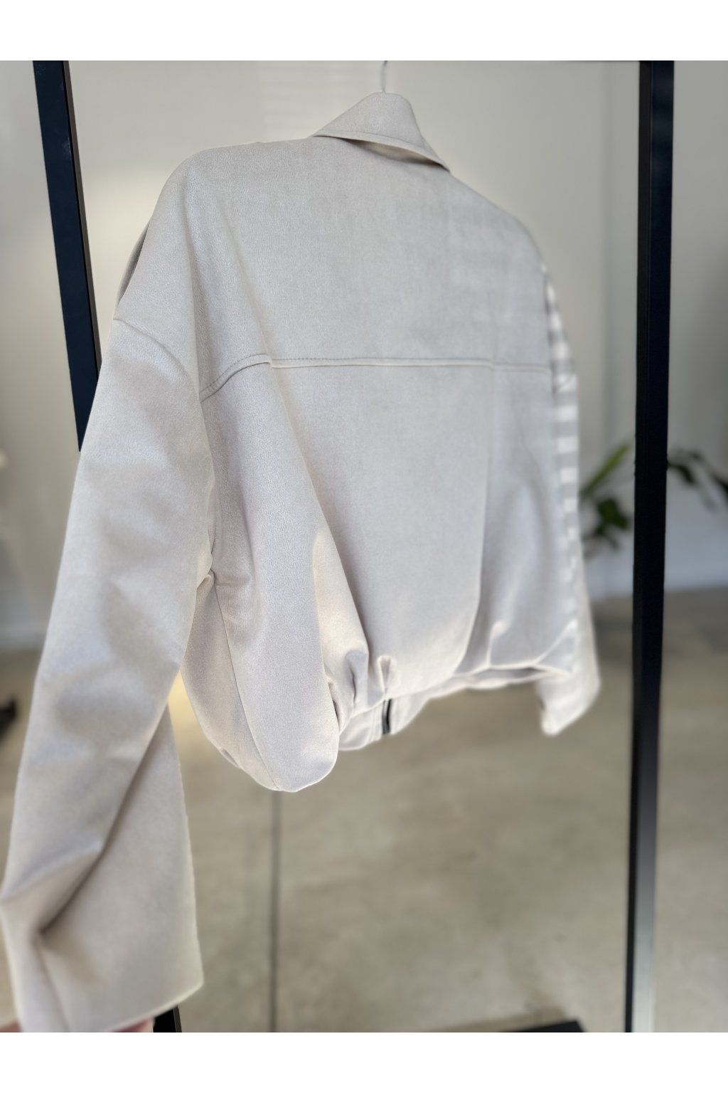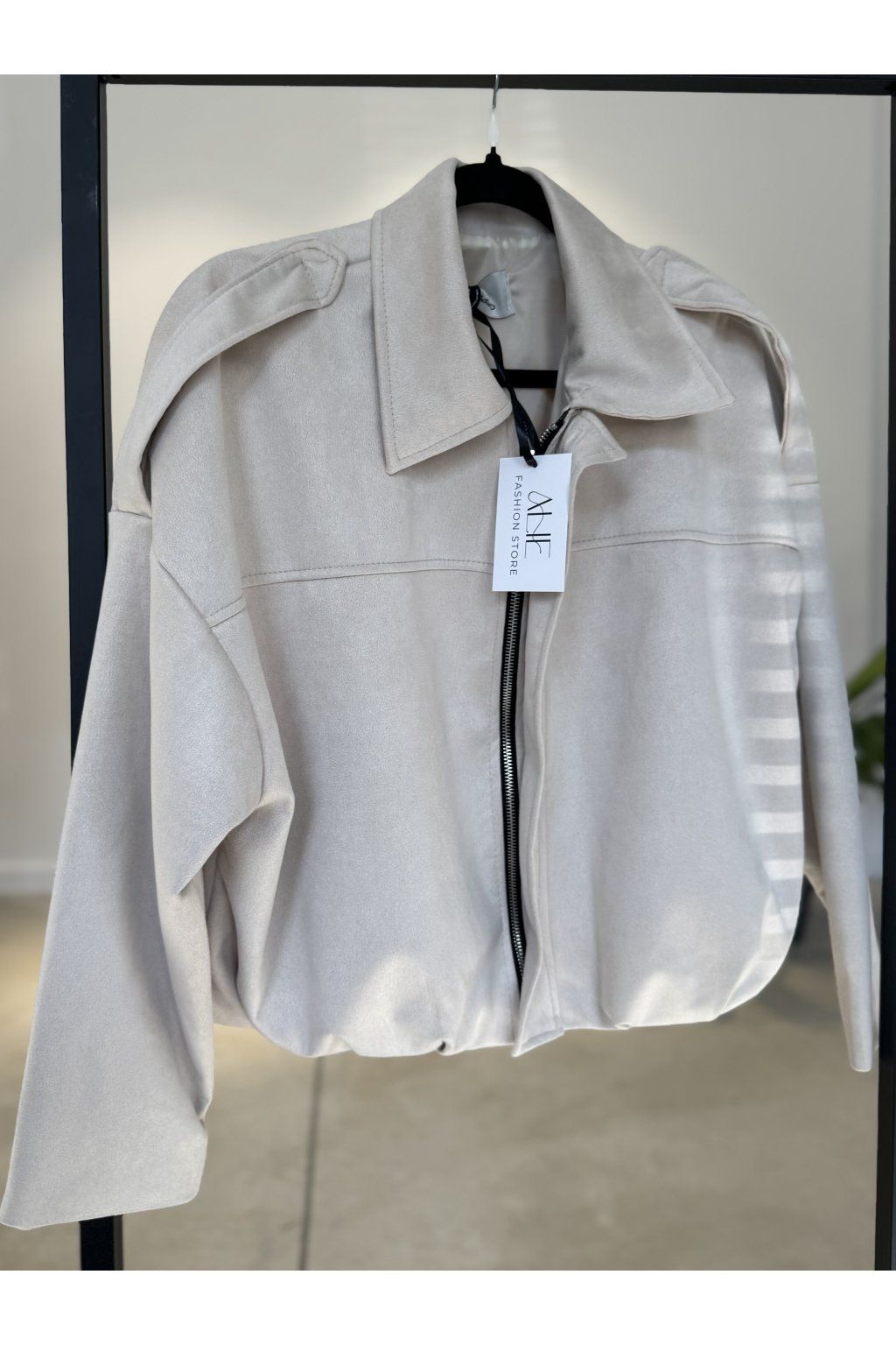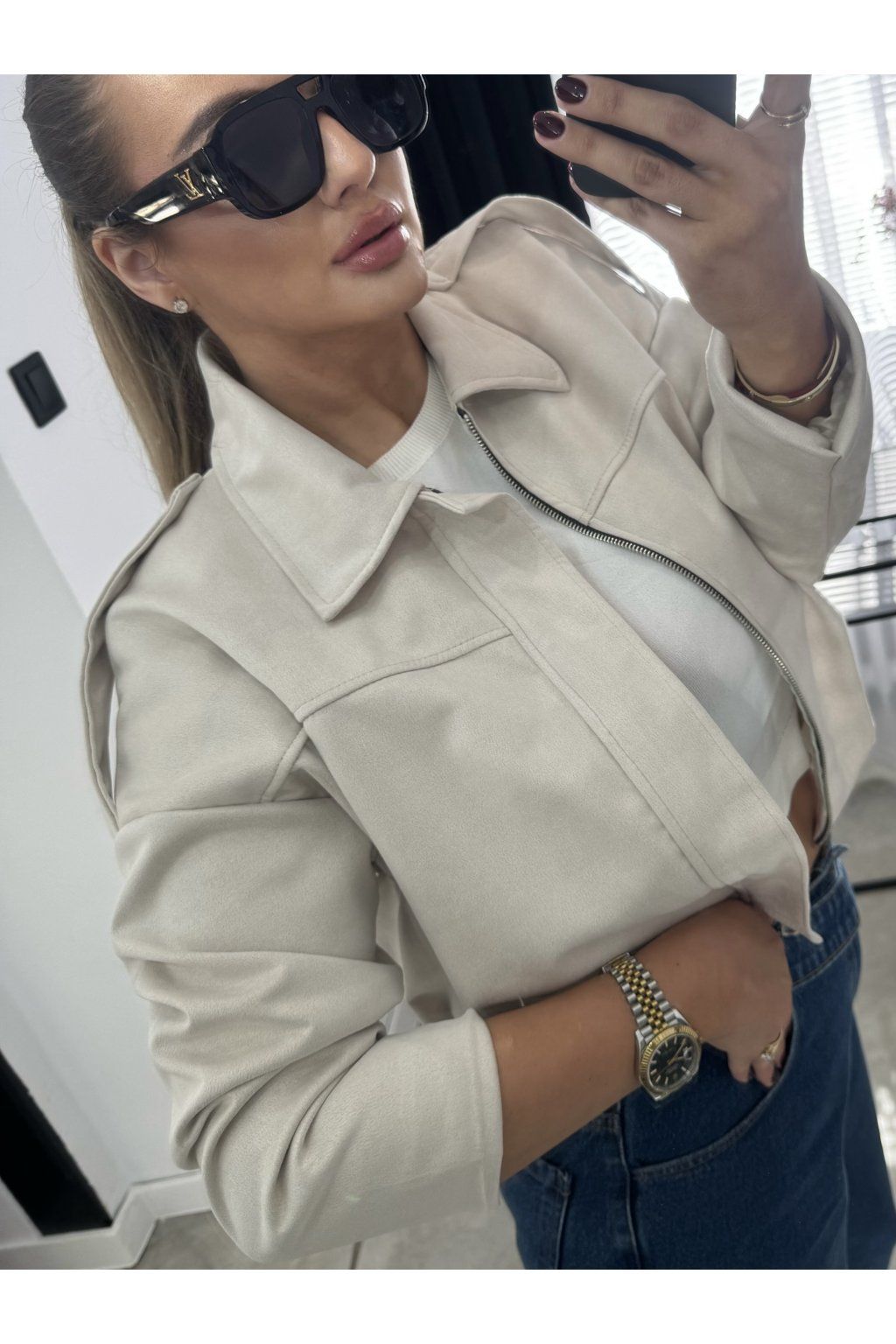 Bunda má výrazný golier, zapínanie na zips a jemne spadnuté ramená, ktoré jej dodávajú trendy mestský charakter. Mäkký semišový materiál pôsobí luxusne a príjemne sa nosí.