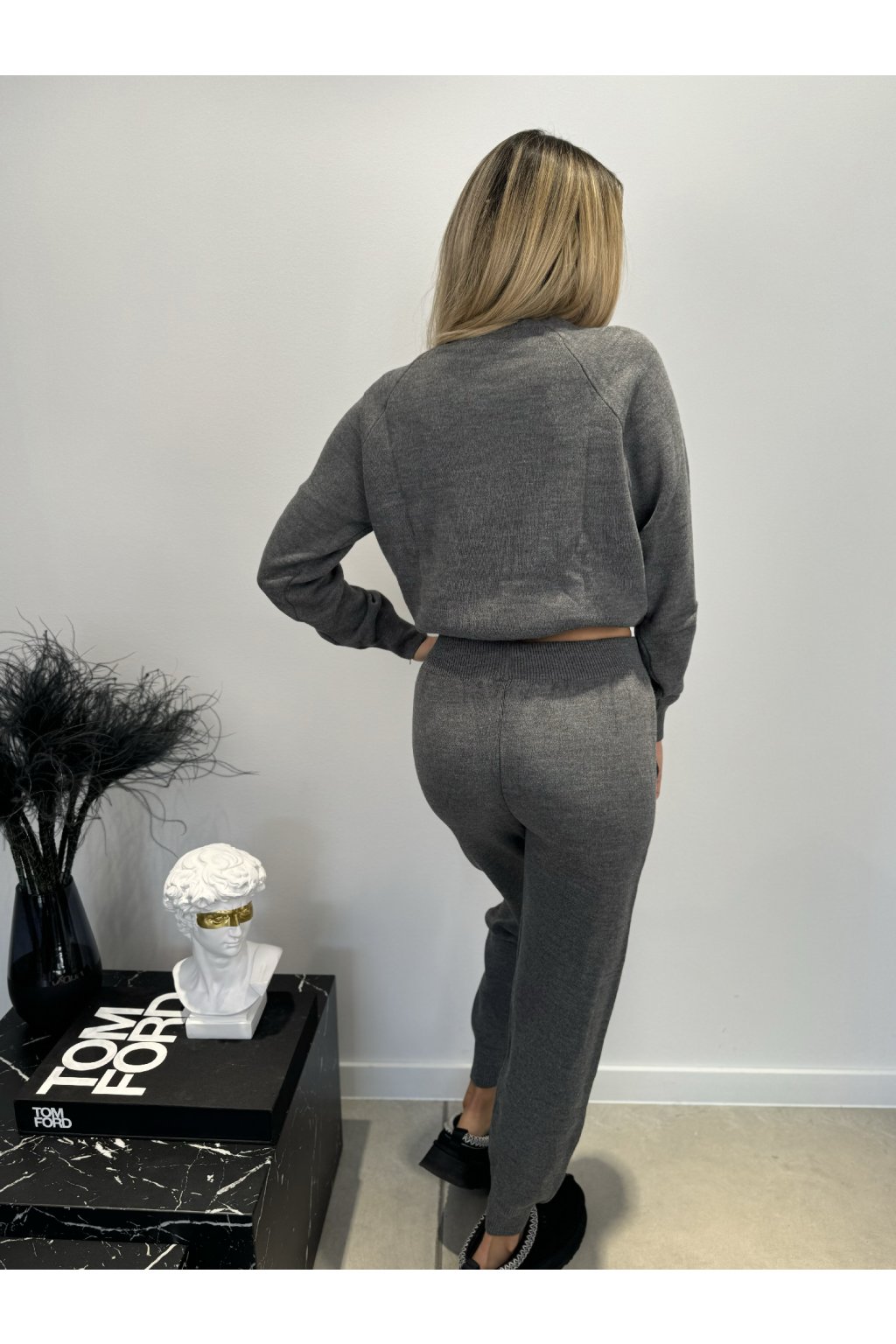 Sivý komplet Mia , ktorý sa skladá z pletených nohavíc a skráteným svetríkom v páse so zaväzovaním.Komplet je UNI velkosťi vhodný pre XS,S,M. Modelka má 170 cm a štandartne nosí velkosť XS/S